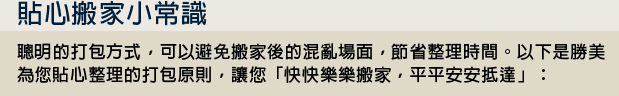 - 可於搬家前提供新家傢俱配置圖,以利工作人員迅速定位