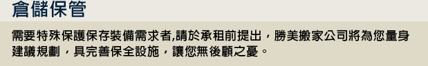 勝美搬家公司為服務客戶,特別設立倉儲服務,無論是裝潢中暫寄放物品、堆高機設備、貨品短中長期暫放租用、機械暫存暫放、家具...等,寄放皆可提出承租,並設有24小時保全系統,妥善管理保護所有存放物品,解決您搬家外的存放需求,貼心周全的服務,全方位搬家,更用心服務。